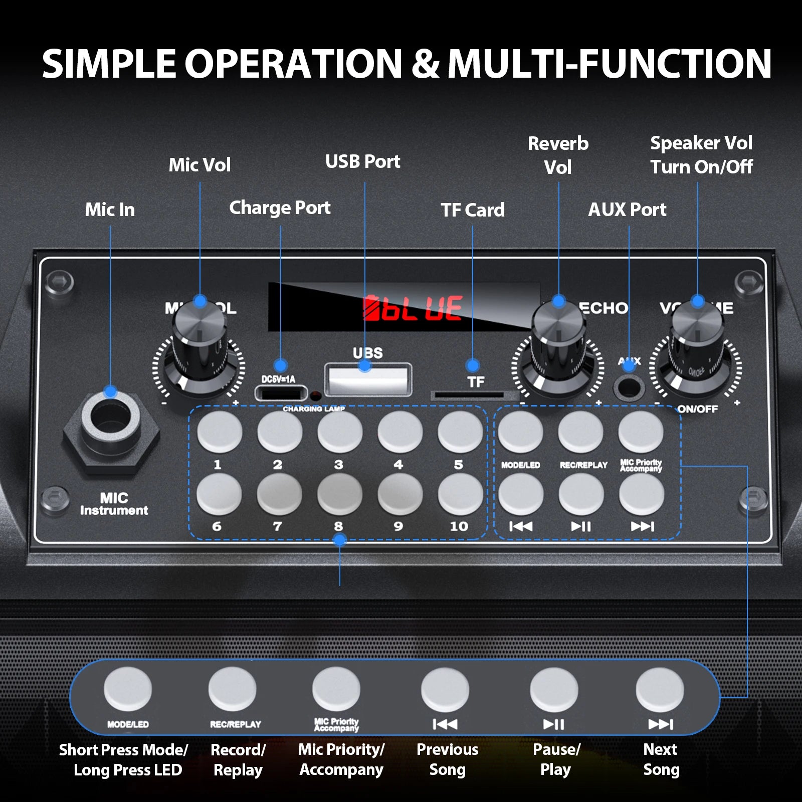 portable karaoke machine is equipped with 6.5-inch Subwoofer with advanced high-bass separation technology for clearer sound and stronger bass, eliminating all noise. It won't distort the audio even at higher volume, bringing amazing music and wonderful atmosphere to your party.