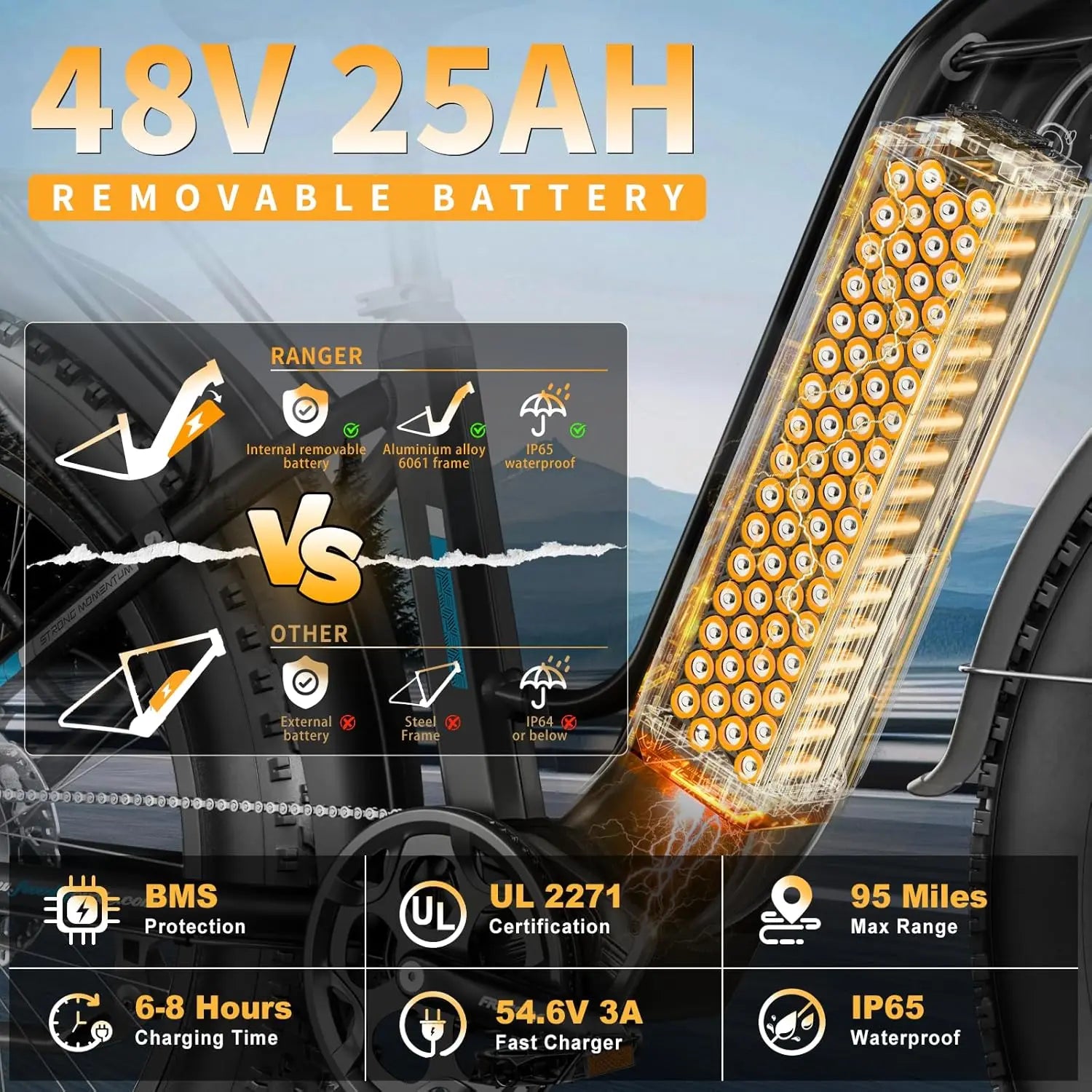 - With a 48V 25Ah removable battery, you’ll reach 60–95 miles per charge and recharge in 5–7 hours.
