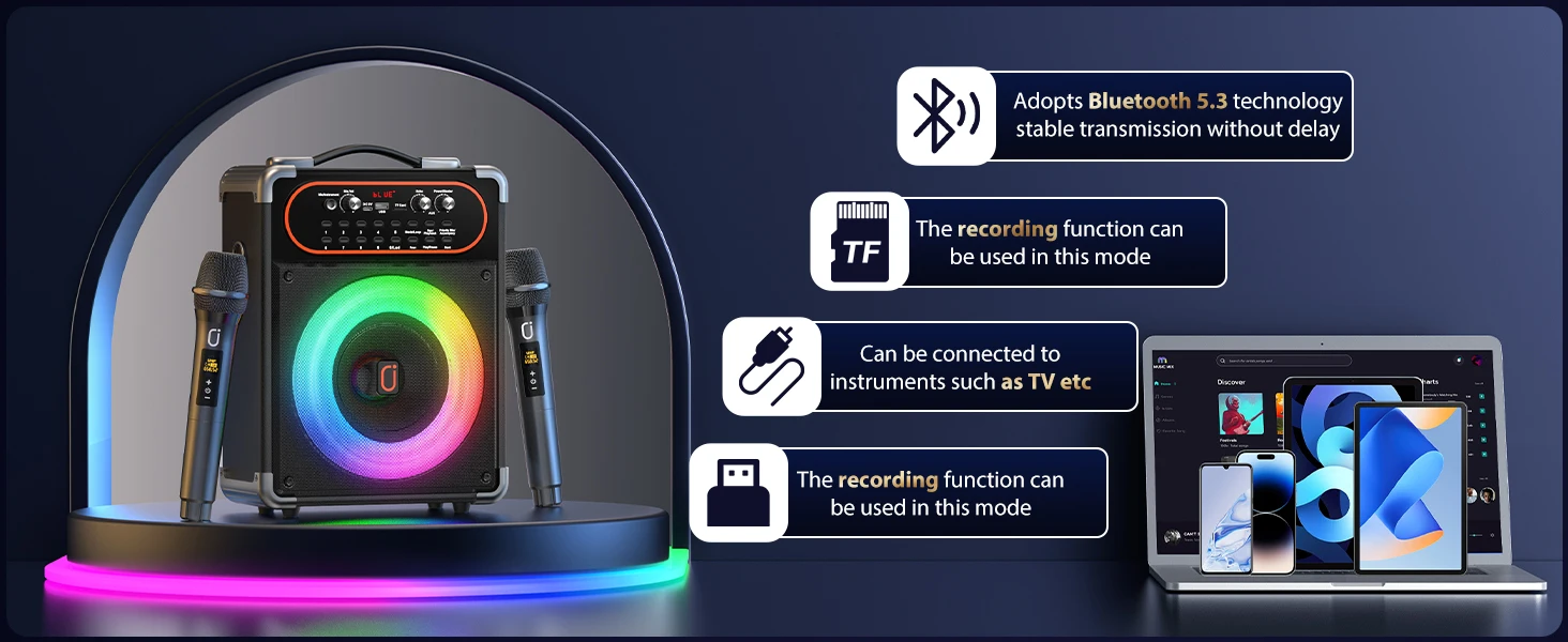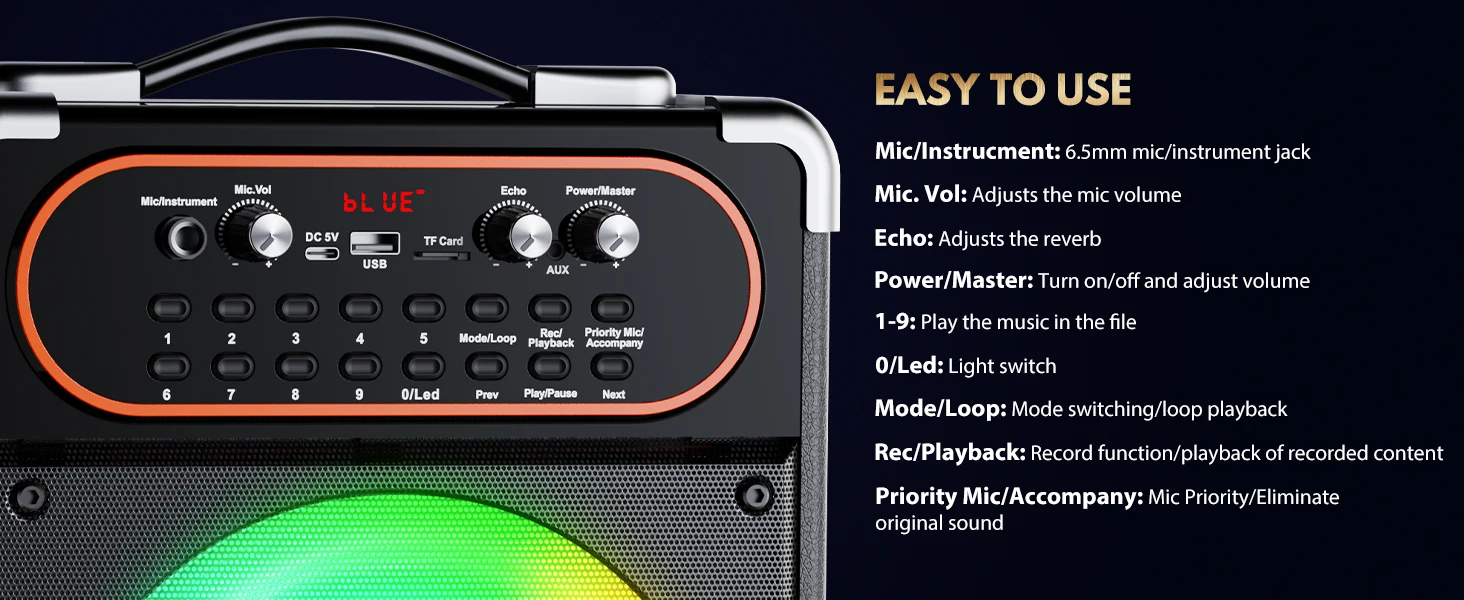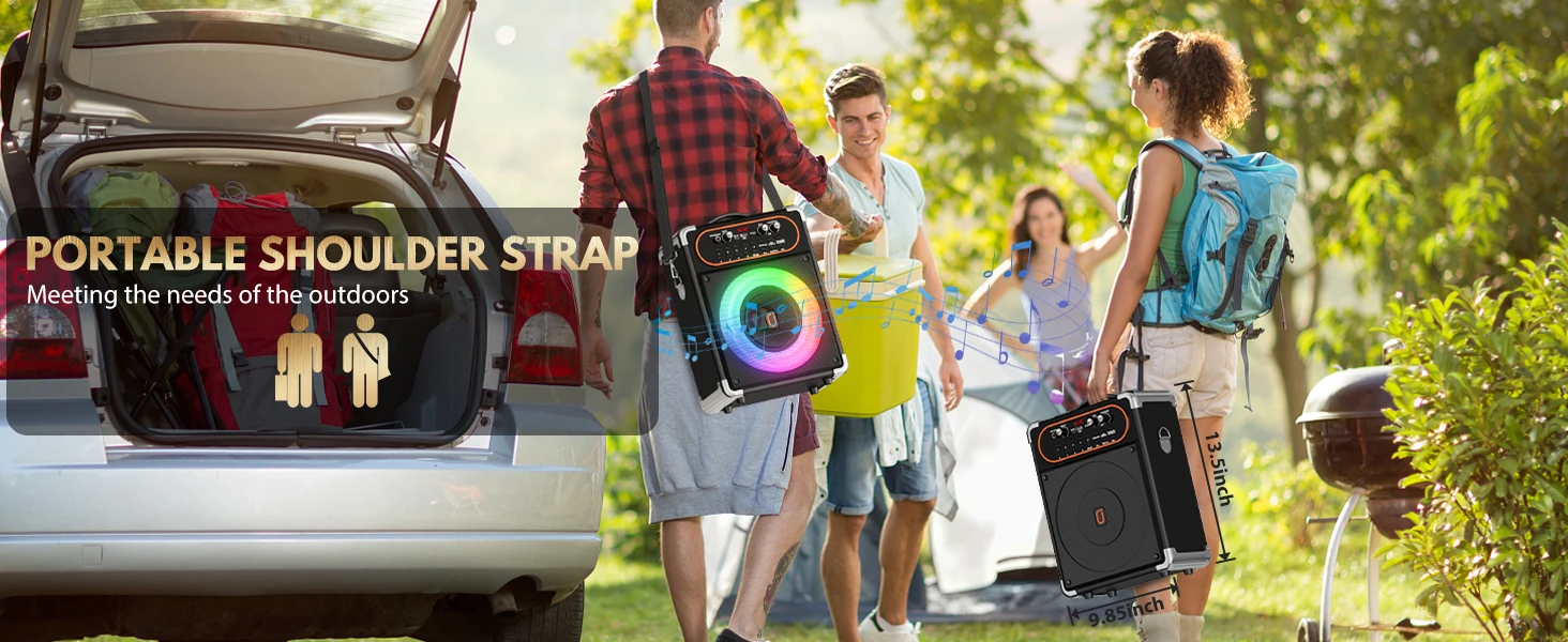 the speaker measures 10*5.5*13.3 inche—compact enough to carry but powerful enough to fill any space. Enjoy your favorite music anytime, anywhere, making it the ultimate party companion.
