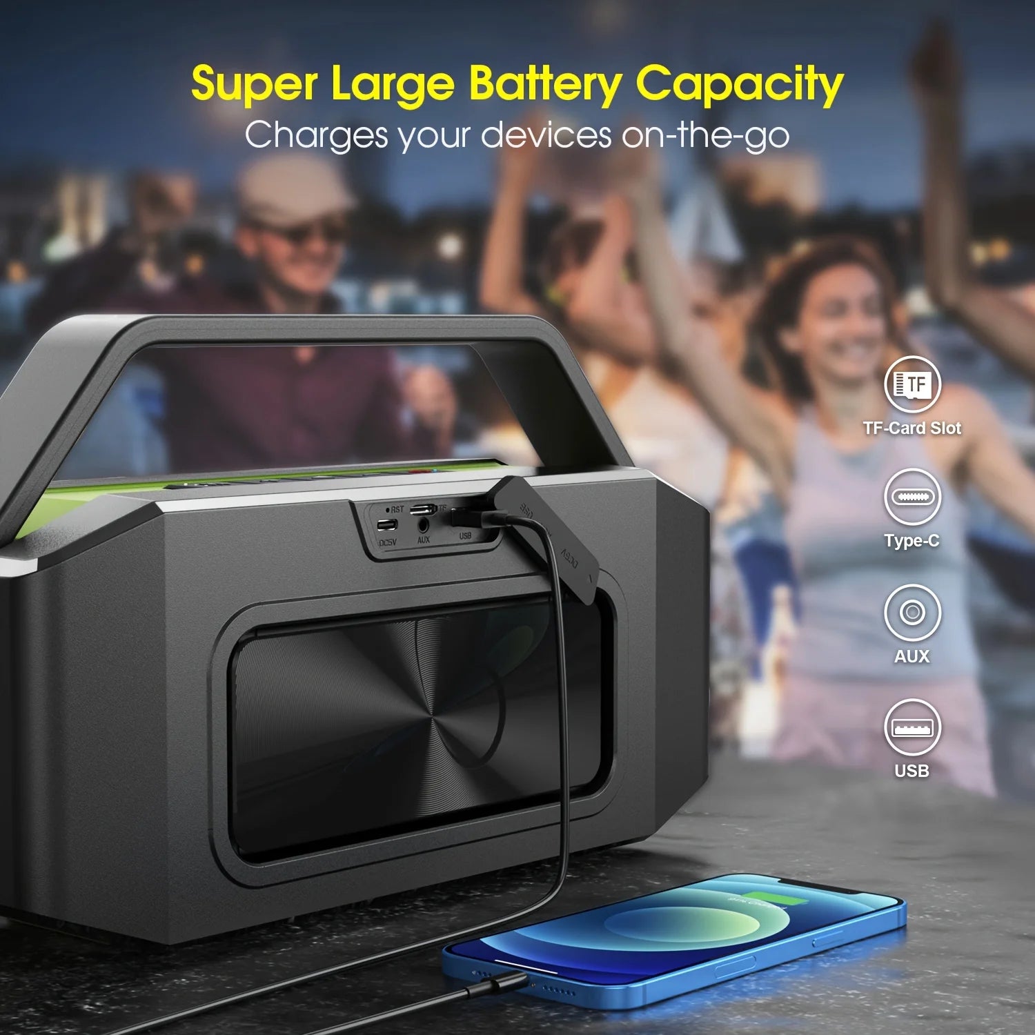 【POWER BANK & PORTABLE HANDLE】This party loud bluetooth speakers portable wireless allows you to play at low volume for up to 40 hours on a single charge. The USB-A port also provides the ability to charge your smart devices, so you don't have to worry about missing important news while on the go. Additionally, this sturdy and shockproof portable speakers bluetooth wireless speaker is easy to carry, thanks to its handle design. (Note: U-DISK is not supported.)